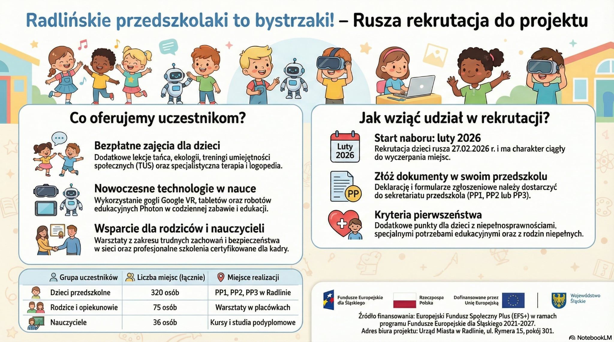 Dziękujemy Miasto Radlin za przepiękną grafikę, która zawiera najważniejsze informacje o rekrutacji oraz o tym, co projekt ma do zaoferowania Wam – rodzicom, naszym przedszkolakom oraz nauczycielom radlińskich przedszkoli.