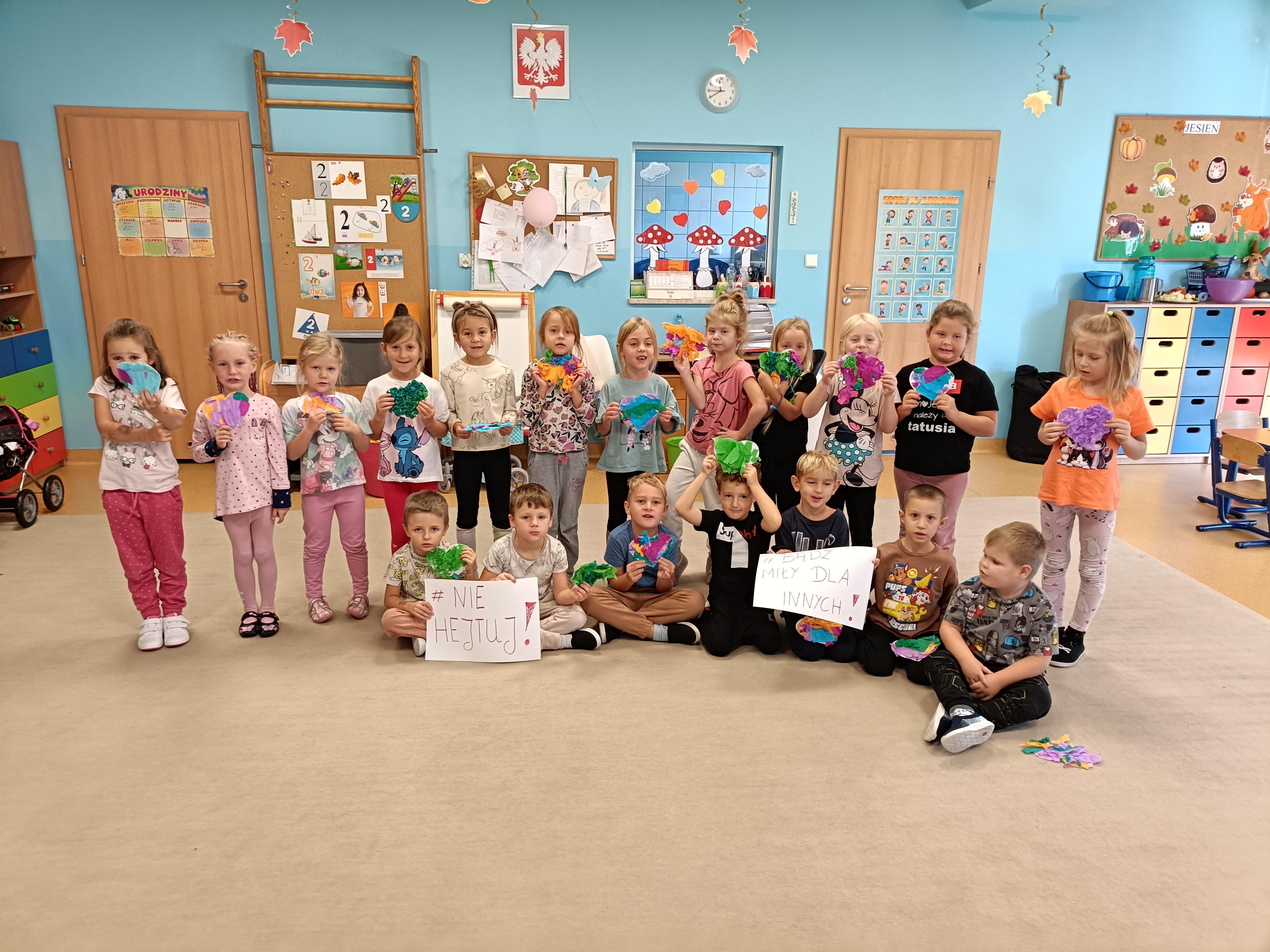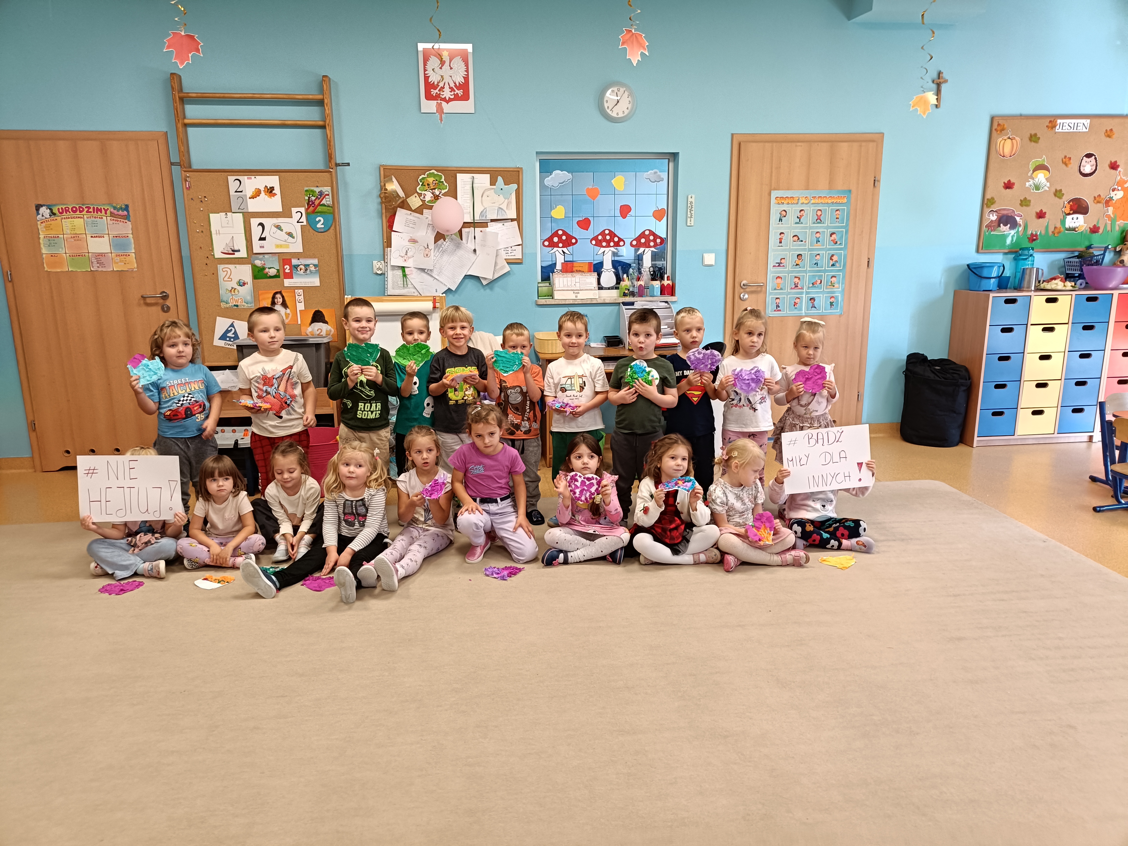 W tym tygodniu dzieci w naszym przedszkolu uczestniczyły w zajęciach o tematyce związanej z przeciwdziałaniem przemocy wśród rówieśników. W przedszkolach w całej Polsce realizowano Tydzień o Budowaniu Relacji - projekt pod patronatem Ministra Edukacji Narodowej. Dzieci poznały historię jeżyka Roro, który miał problem z radzeniem sobie z emocjami oraz z nawiązaniem kontaktu z rówieśnikami. Wszystkie dzieci wykonały Serduszka dobrych słów.